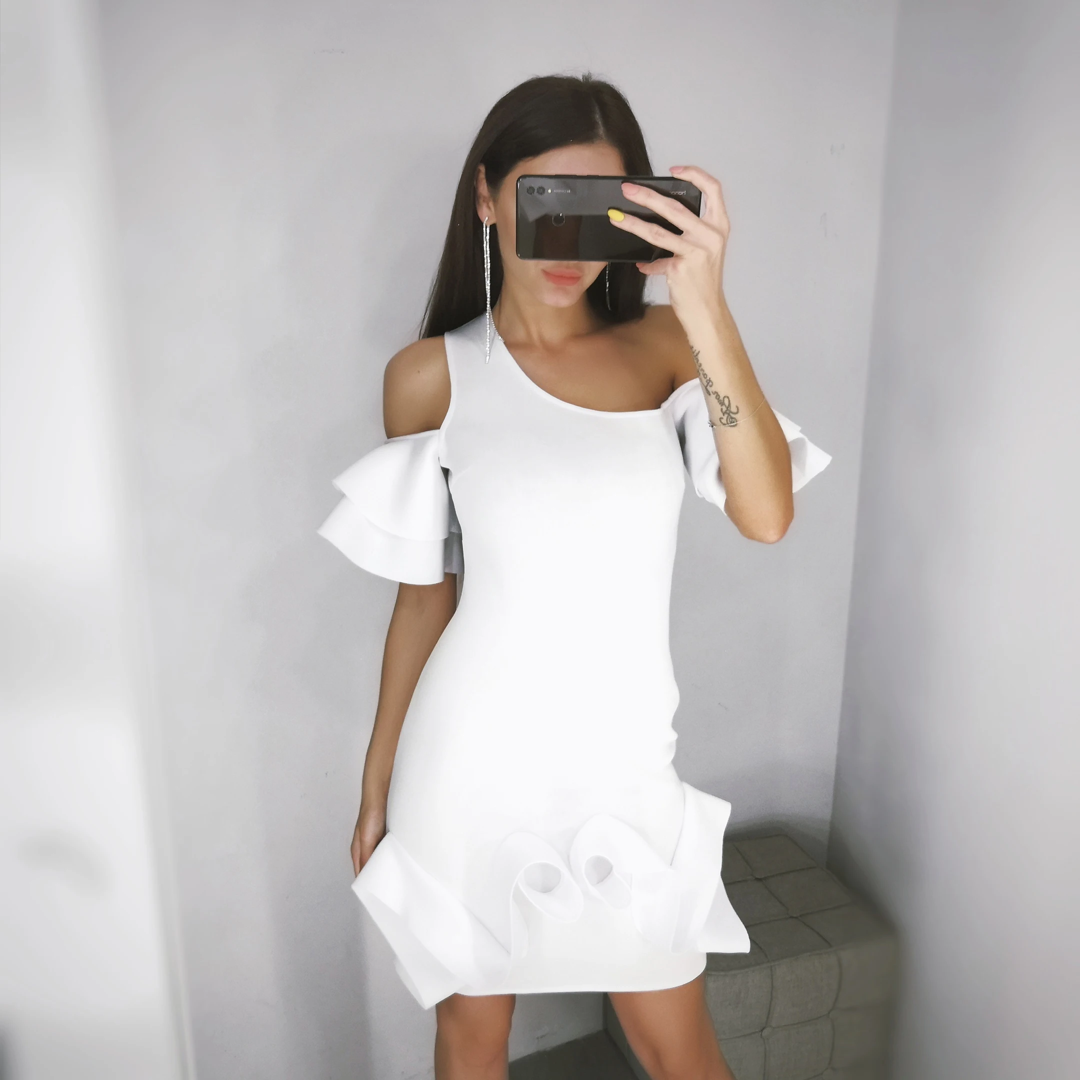 Women White Party Dress One Shoulder Ruffles Bodycon Slim Evening Clubwear Dating Night Dinner Pack